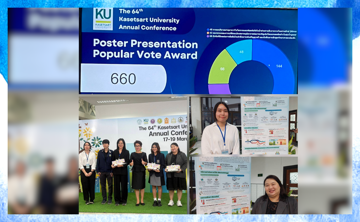 นางสาวลพรรณพลอย ชาวเรือ ตำแหน่ง วิศวกรชลประทานชำนาญการ รางวัล การนำเสนอผลงานทางวิชาการภาคโปสเตอร์การประชุมทางวิชาการของมหาวิทยาลัยเกษตรศาสตร์ ครั้งที่ 64 รางวัล Popular Vote อันดับ 2